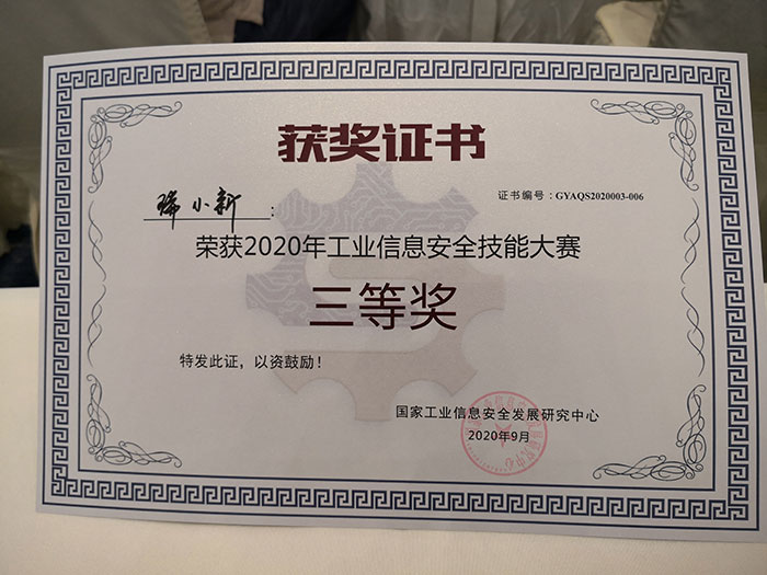 來自我司江蘇瑞新信息技術(shù)股份有限公司的“瑞小新”戰(zhàn)隊經(jīng)過全國復(fù)賽等多輪考驗,最終脫穎而出,以第六名的成績喜獲2020年工業(yè)信息安全技能大賽三等獎。