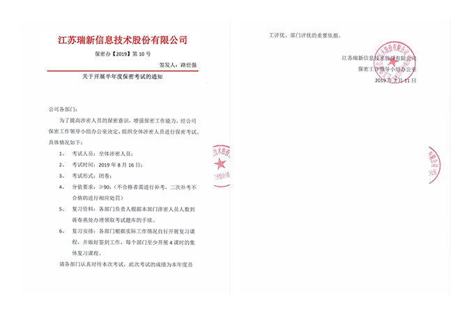 為了提高涉密人員的保密意識,增強保密工作能力。2019年7月11日,公司發布《關于開展半年度保密考試的通知》。