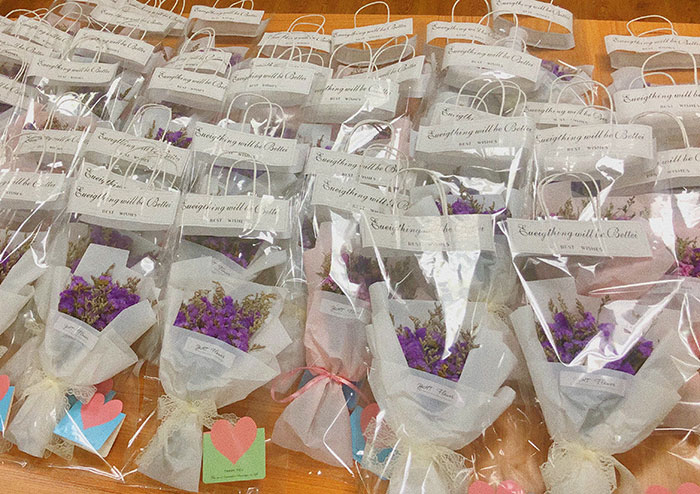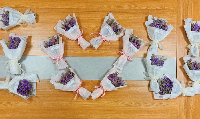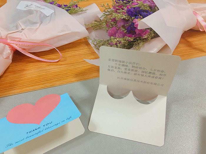 有別于傳統的做游戲、表演的聯誼會,公司行政部同事親手包扎愛的小花束,將包好的小花束分發給瑞新小伙伴們。現場氣氛熱烈,洋溢著溫馨甜蜜的氣息。