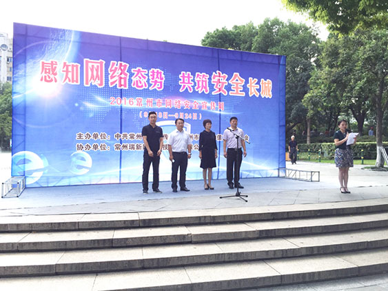 正值“九·一八事變”85周年之際,以“感知網絡態勢,共筑安全長城”為主題的“2016常州市網絡安全宣傳周”啟動儀式于市中心人民公園舉行。常州市委外宣辦主任、市政府新聞辦主任、市委宣傳部副部長孫潔茹,常州市經濟和信息化委員會副主任楊軍,常州市委與常州瑞新網絡科技股份有限公司各位領導出席了啟動儀式。