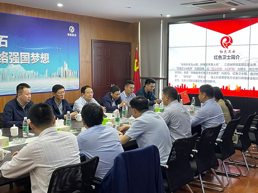 2021年5月21日下午,江蘇省密碼管理局科技處技術中心聯合支部、常州市密碼管理局黨支部領導一行蒞臨江蘇瑞新信息技術股份有限公司黨支部調研指導工作。