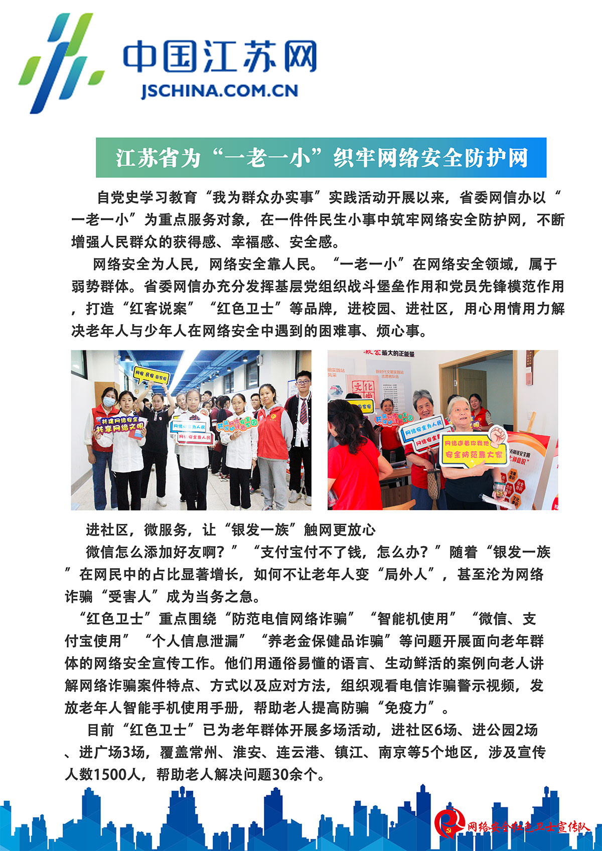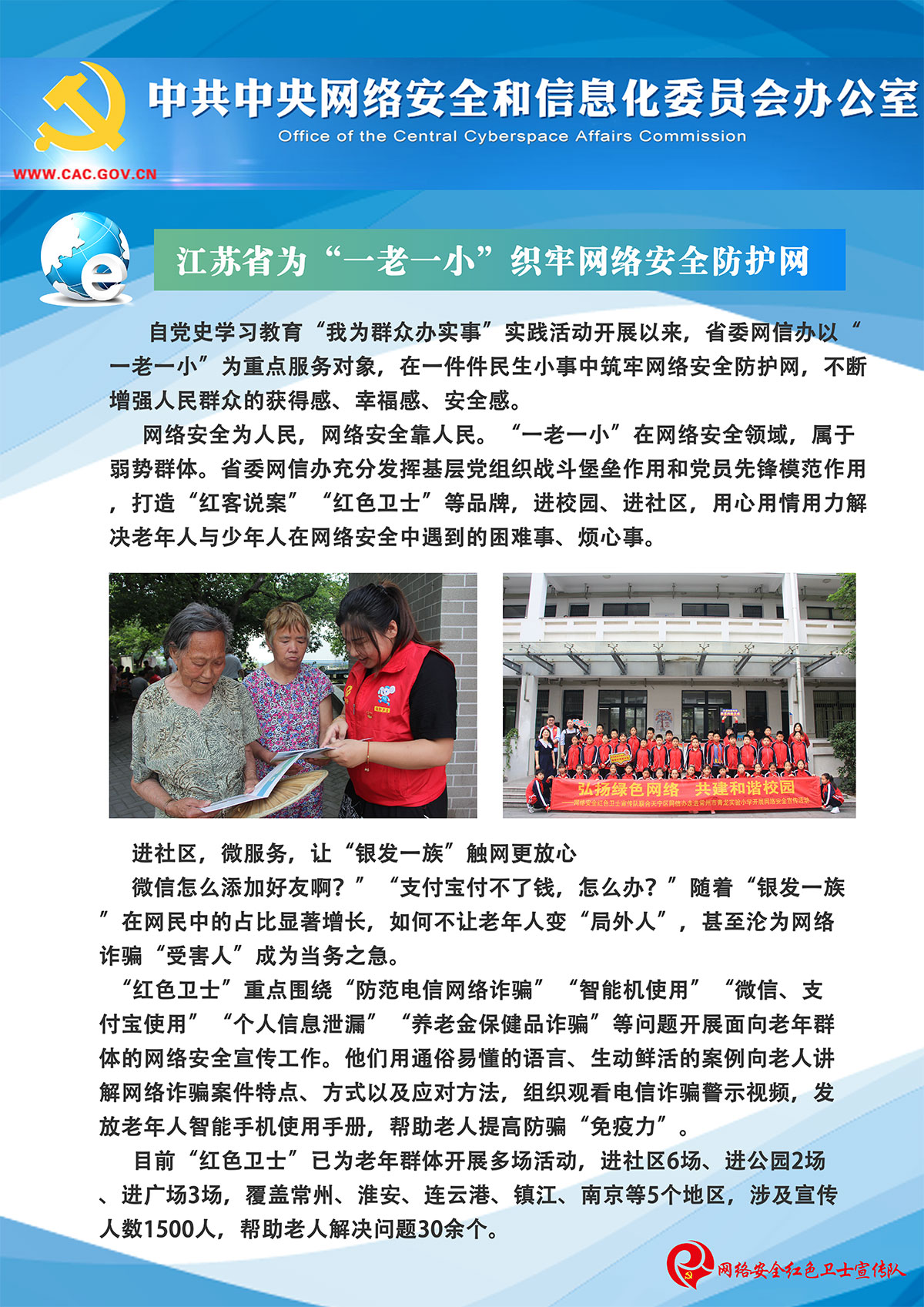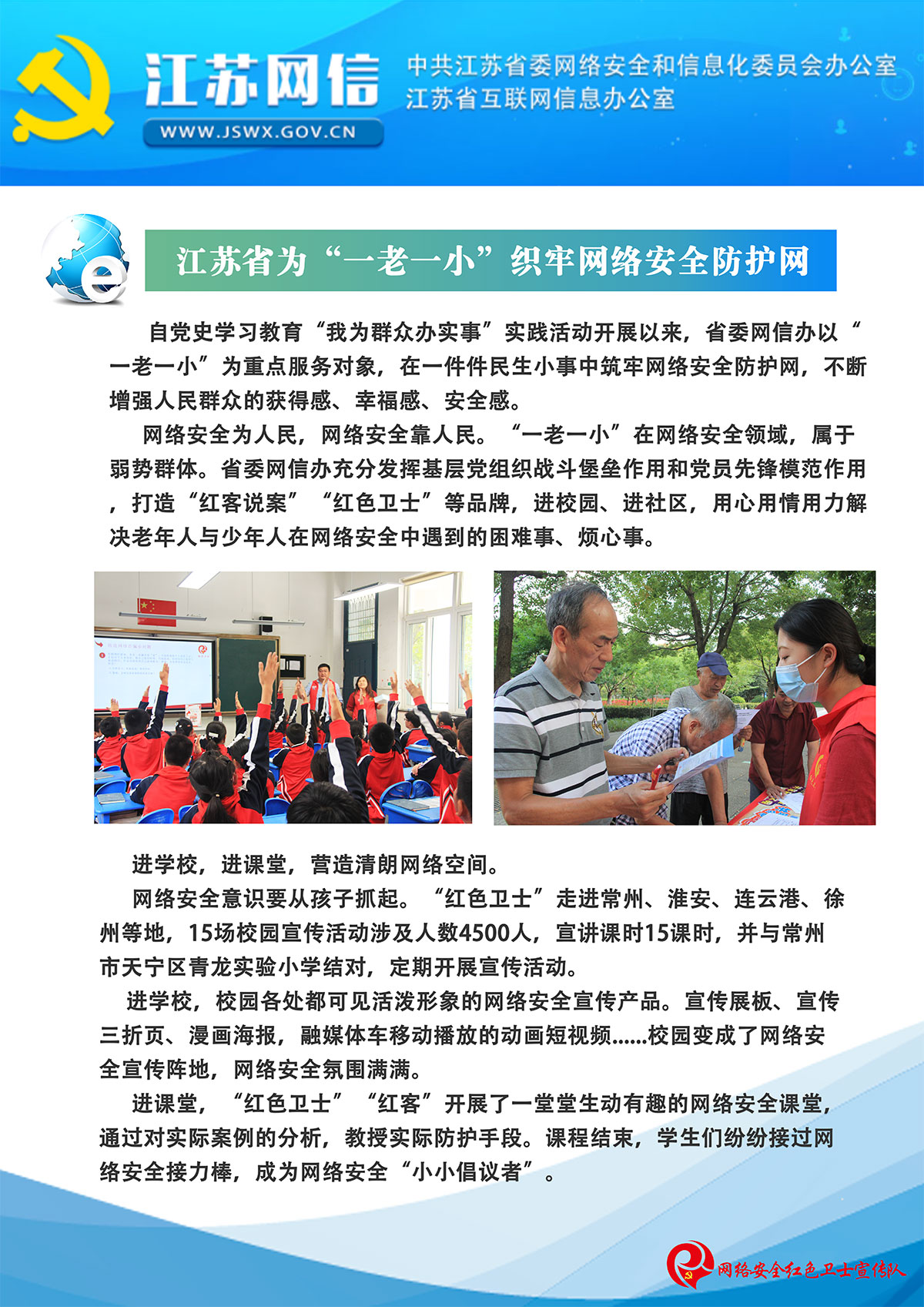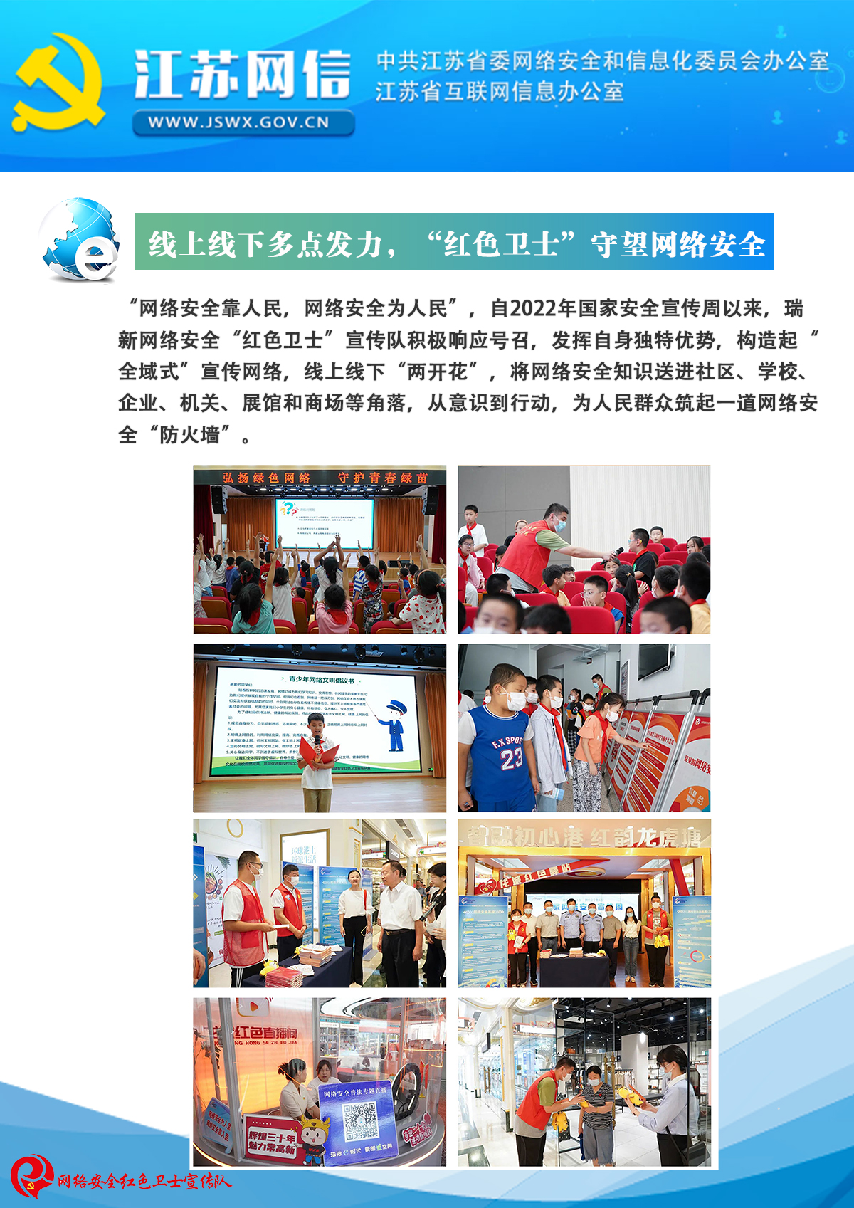 “網絡安全為人民,網絡安全靠人民”,江蘇瑞新黨支部立足業務,擔負起社會責任,打造“紅色衛士e先鋒”黨建品牌,以“紅心向黨、e心護網”為理念,成立常州網絡安全“紅色衛士”宣傳隊。長期開展網絡安全宣傳進校園、進課堂、進社區、進企業活動,以展板、宣傳片等多媒體互動的形式,近距離的、多場次的進行點對面宣傳,走進人民群眾基層生活答疑解惑。