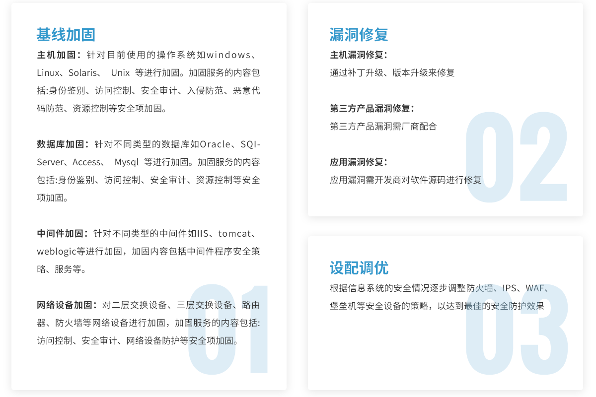 安全加固是指參考國內國際權威的系統安全配置標準,并結合用戶信息系統實際情況,在用戶允許的前提下,對信息系統涉及的主機、網絡設備、應用及數據庫進行安全配置加固、漏洞修復和安全設備調優。